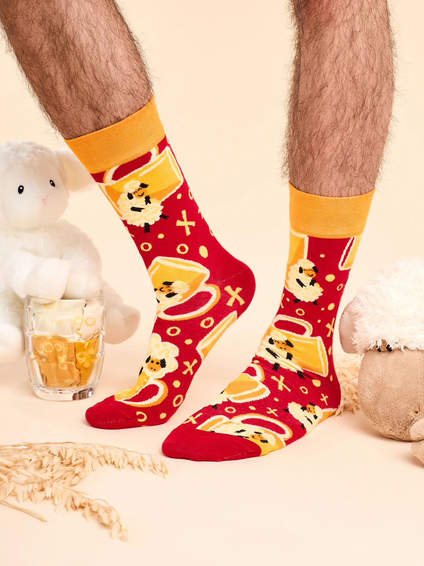 Te preguntas qué tienen la cerveza y las ovejas en común, ¿verdad? ¡Pues, bien, ambas puedes encontrarlas en nuestros calcetines alegres! Póntelos y reparte alegría a tu alrededor.